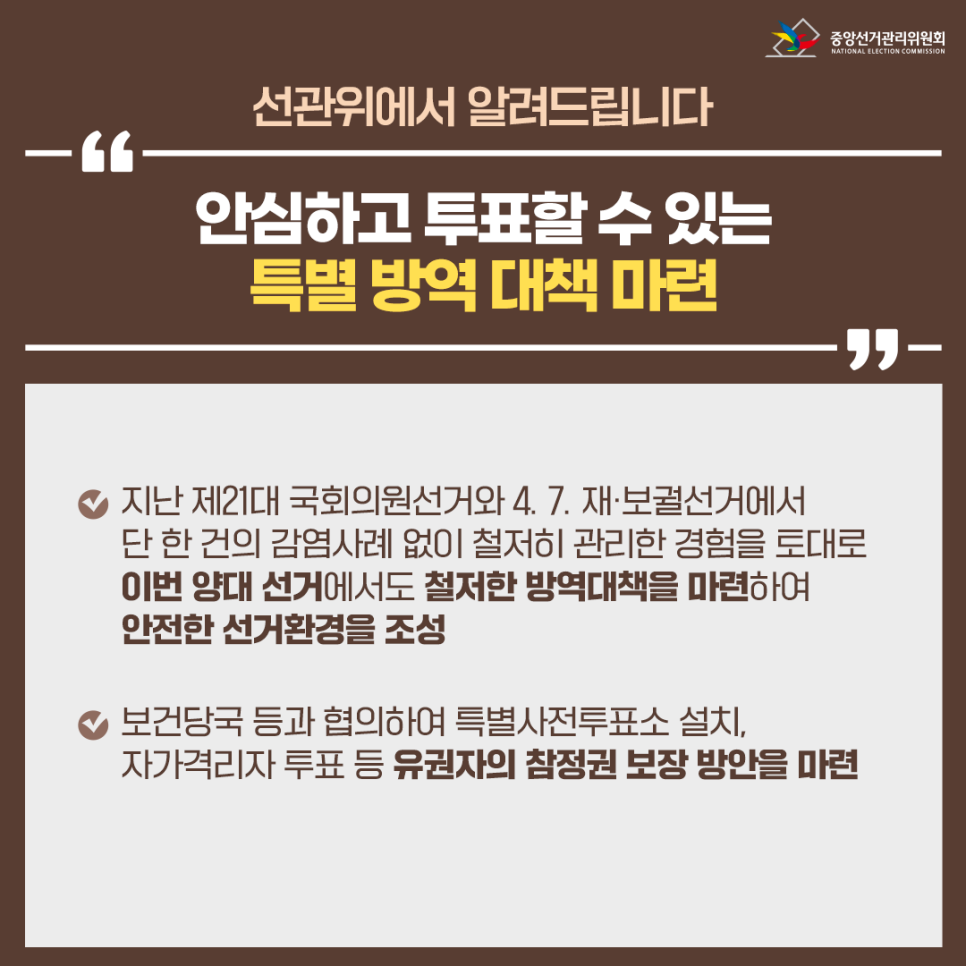 지난 제21대 국회의원선거와 4. 7. 재·보궐선거에서 단 한 건의 감염사례 없이 철저히 관리한 경험을 토대로 이번 양대 선거에서도 철저한 방역대책을 마련하여 안전한 선거환경을 조성하겠습니다.