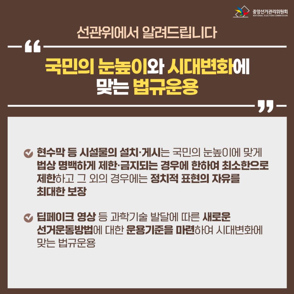 현수막 등 시설물의 설치·게시는 국민의 눈높이에 맞게 법상 명백하게 제한·금지되는 경우에 한하여 최소한으로 제한*하고 그 외의 경우에는 정치적 표현의 자유를 최대한 보장합니다.
