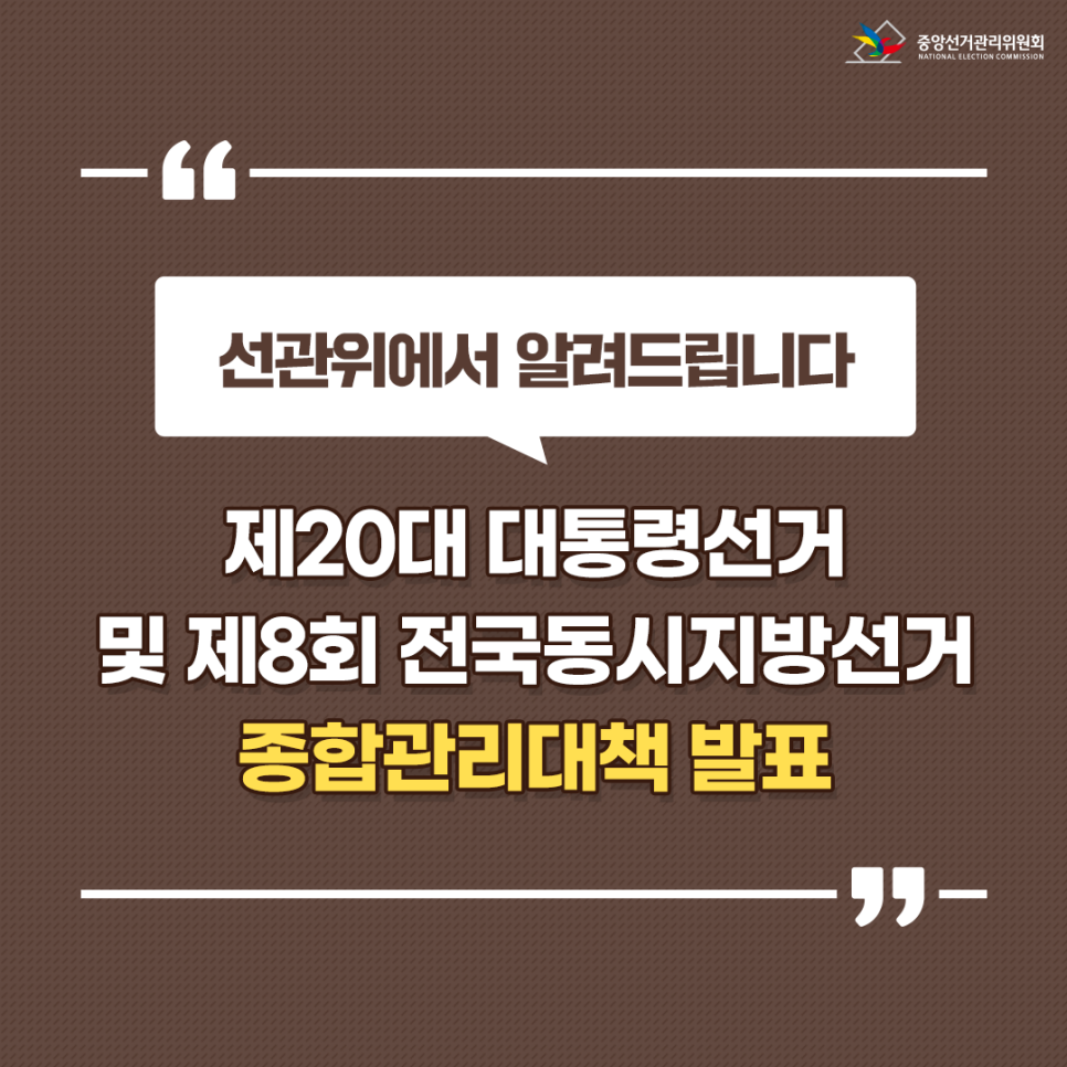 중앙선관위, 제20대 대통령선거 및 제8회 전국동시지방선거 종합관리대책 발표