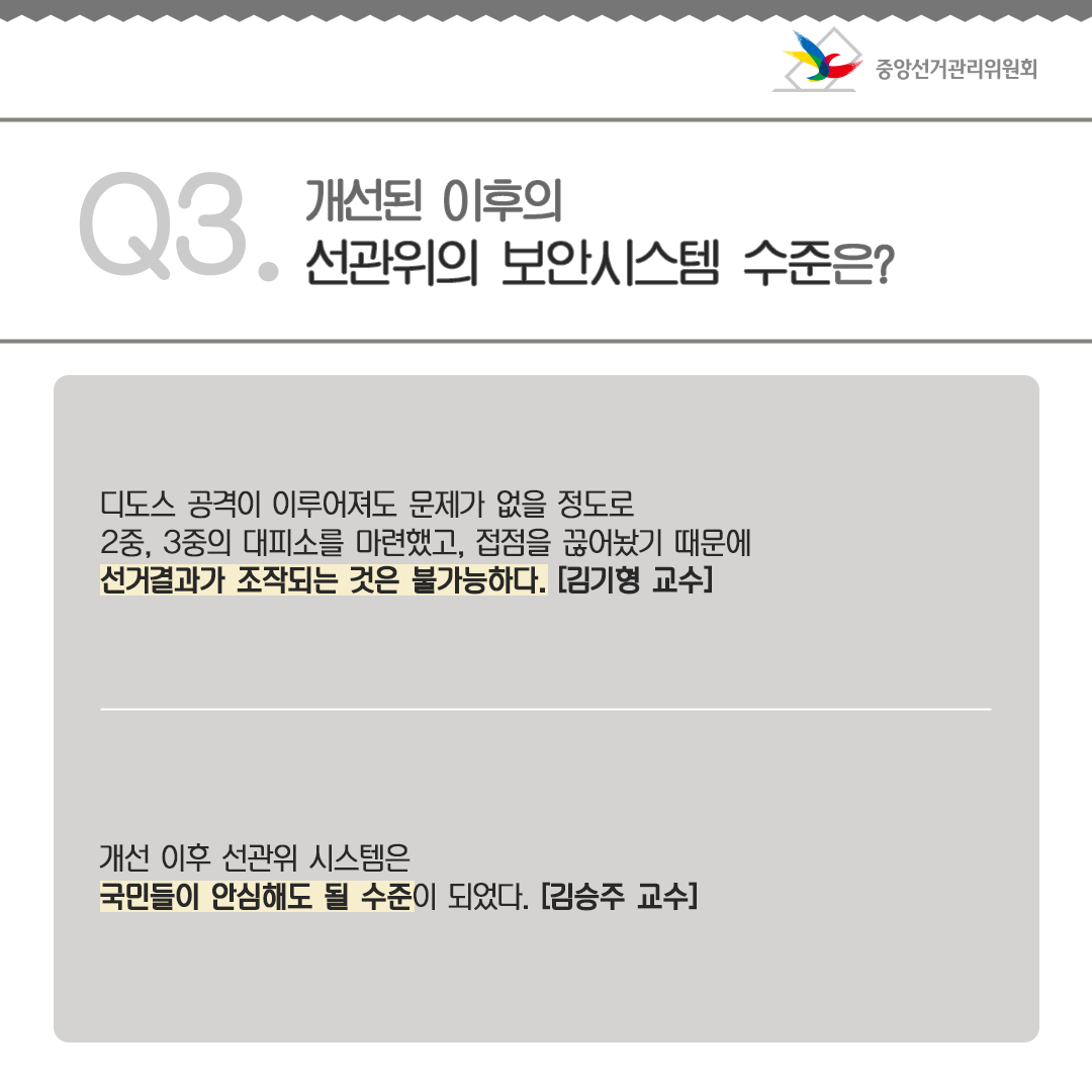 디도스 공격이 이루어져도 문제가 없을 정도로 2중, 3중의 대피소를 마련했고, 접점을 끊어놨기 때문에 선거결과가 조작되는 것은 불가능하다. [김기형 교수]