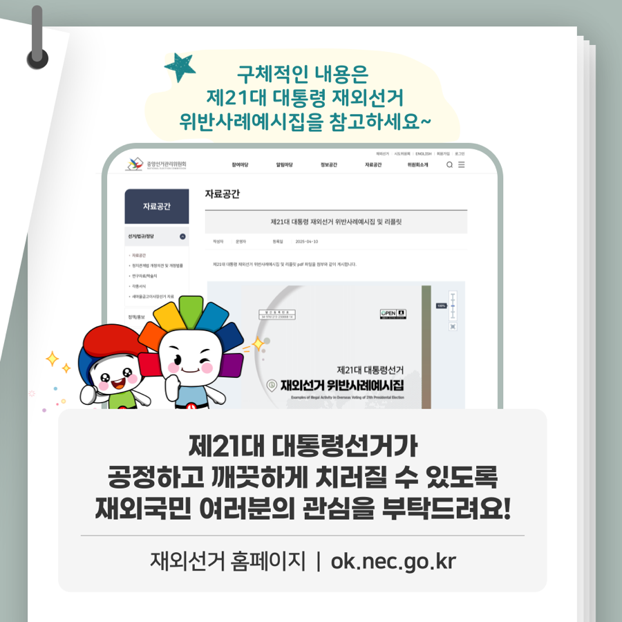 제21대 대통령선거가 공정하고 깨끗하게 치러질 수 있도록 재외국민 여러분의 관심을 부탁드려요!