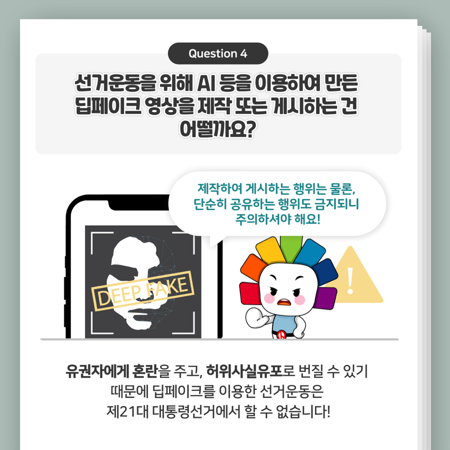 Q. 선거운동을 위해 AI 등을 이용하여 만든 딥페이크 영상을 제작 또는 게시하는 건 어떨까요?