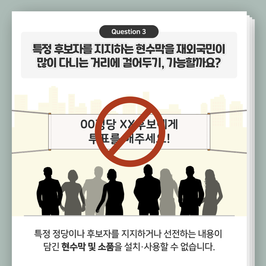 Q. 특정 후보자를 지지하는 현수막을 재외국민이 많이 다니는 거리에 걸어두기, 가능할까요?