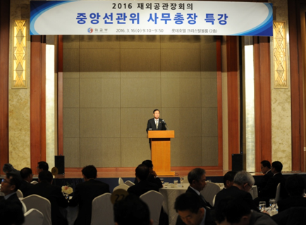 The Secretary General of the National Election Commission (NEC) of the Republic of Korea Kim Yong-Hi gave a lecture entitled Overseas Voting Management Measures for the 20th National Assembly Elections to 177 heads of overseas missions from around the world at the Lotte hotel on Wednesday, March 16.