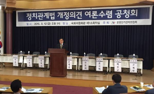 The National Election Commission (NEC) of the Republic of Korea hosted a Public Hearing for Comments and Opinions on Political Laws at the National Assembly attended by experts from academia, the media, civic groups and political parties on August 12.