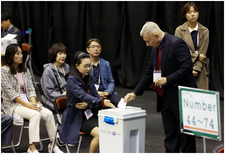 The NEC said that it was entrusted to manage the entire election, including candidate registration, voting and counting, according to the Act on Elections Entrusted by Public Organizations, etc. and Kukkiwon’s Articles of Association. In particular, the NEC provided simultaneous interpretation of the candidate''s speeches and the voting and counting procedures for non-Korean citizens, including global Taekwondo officials, who participated in the vote.