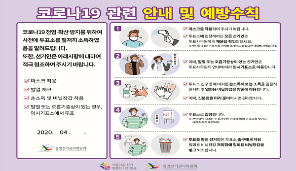 The NEC Chairperson delivered a message to voters ahead of elections laying out measures for their safety and encouraging citizens to prepare themselves and turnout to vote: https://www.nec.go.kr/engvote_2013/04_news/01_02.jsp?num=212&pg=1&col=&sw=