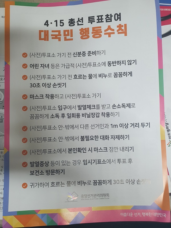 The National Election Commission (NEC) of the Republic of Korea confirmed 14,330 polling stations will be set up for the 21st National Assembly election. It also said that each household was sent voting information and the relevant candidate and political party election material, and the 100,529 registered home voters were also sent their home voting ballot papers.