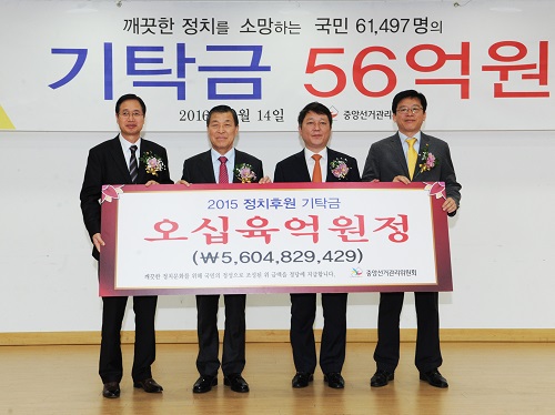 The National Election Commission of the Republic of Korea (NEC) announced that throughout last year, with a hope for clean elections, citizens deposited a total of 5.59 billion won ($4.6 million USD) in election funds with the NEC, which amounted to 1.19 billion won more than the 2014 total of 4.4 billion won.