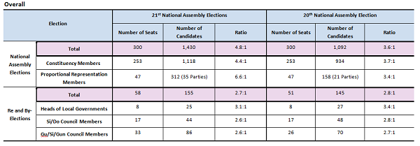 In addition, for the re and by-elections to be held together with the 21st National Assembly elections, 25 candidates registered in 8 elections for heads of local governments, 44 candidates registered for 17 Si/Do council member elections and 86 candidates registered for Gu/Si/Gun council member elections.