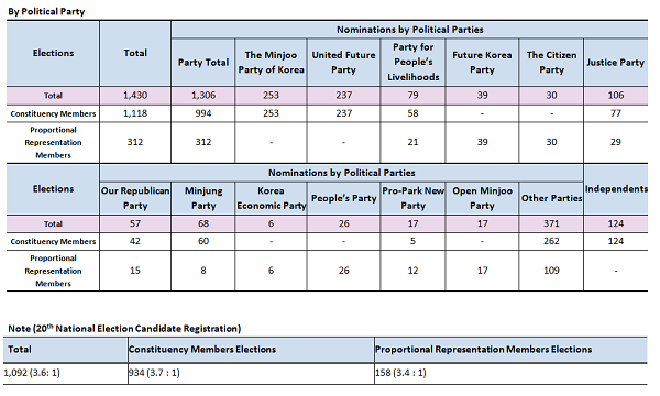 The National Election Commission (NEC) of the Republic of Korea announced the close of candidate registration for the 21st National Assembly elections, with 1,118 candidates from 21 political parties registering for elections for constituency members at an average of 4.4 candidates per seat. Also 312 candidates registered for elections for proportional representation members from 35 political parties.