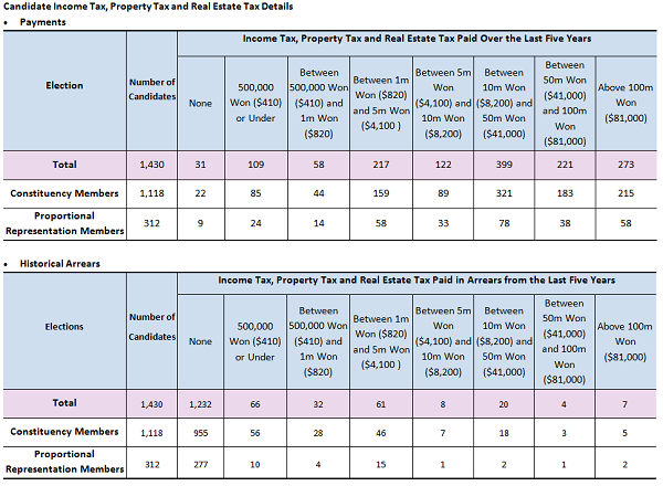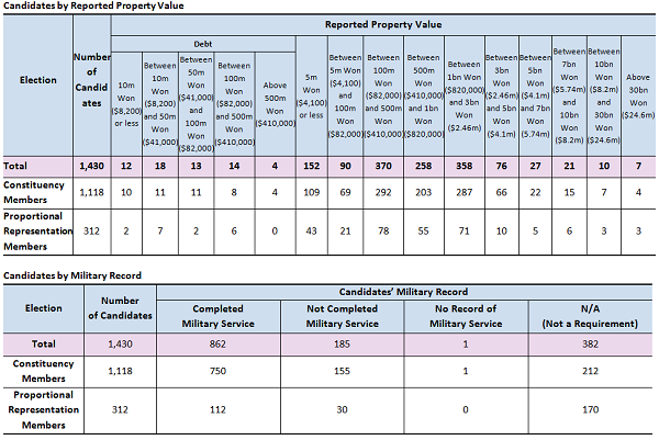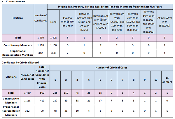 Candidates'' property status, military service history, criminal record, academic background, tax history and public official election history will be published until election day on the NEC election data system (http://info.nec.go.kr). The election pledges submitted by political parties and candidates will be sent to people’s homes together with voting information on April 5.