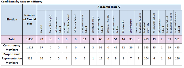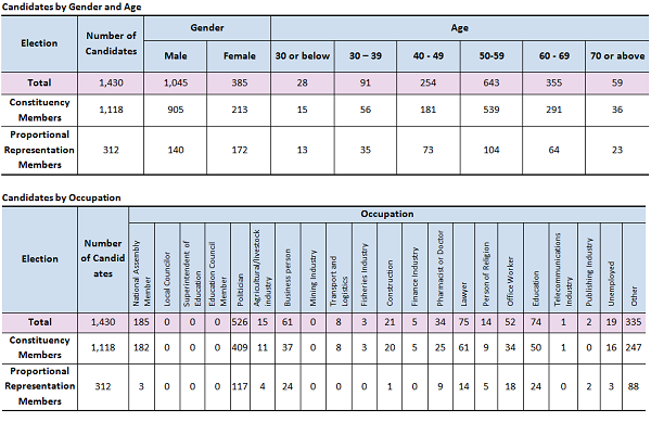 • Political Parties Fielding Candidates in elections for both Constituency Members and Proportional Representation Members: 15 • Political Parties Fielding Candidates only in elections for Constituency Members: 6 • Political Parties Fielding Candidates only in elections for Proportional Representation Members: 20