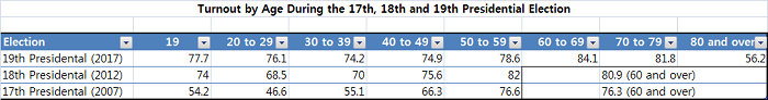 An analysis of 19th presidential election voter turnout carried out by the National Election Commission (NEC) of the Republic of Korea has revealed that there was a high turnout of over 70% in nearly every age group during the election. Turnout among people in their 60s and 70s was 84.1% and 81.8% respectively, and all other groups in their 50s or under recorded a turnout of over 70%.
