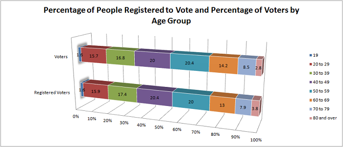 By age group, early voter turnout was highest among 19 year olds (35.3%) and those in their 20s (35.7%), followed by those in their 30s (25.8%), 50s (25.7%), 60s (24.6% %) and finally in their 40s (23.8%).