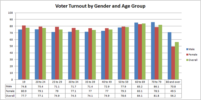 The highest turnout was recorded by the 60s age group (84.1%) followed by those in their 70s (81.8%) and 50s (78.6%). Meanwhile the 20s age group showed a turnout of 76.1%, 30s 74.2% and those in their 40s recorded a 74.9% turnout.