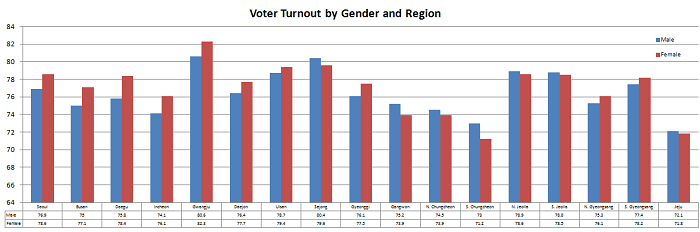 Of all the regions, Daegu showed the largest difference in turnout by gender, a difference of 2.6% (75.8% male, 78.4% female turnout) whilst Busan, Incheon, Chungnam, Seoul and Gwangju showed a difference of around 2%.