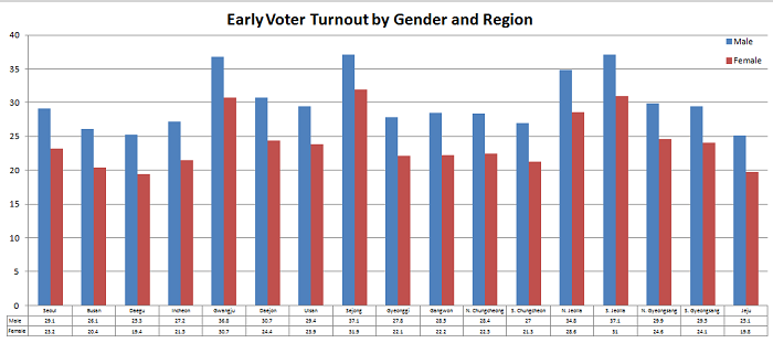The regions with the highest early voting turnout were Sejong (37.1% male, 31.9% female turnout), Jeonju (37.1% male, 31.0% female turnout), and Gwangju (36.8% male and 30.7% female turnout).