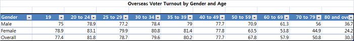 In the 19th presidential election, overseas turnout reached 75.3% of those that registered for absentee and overseas voting, with women (75.9%) recording a marginally higher turnout than men (74.7%).