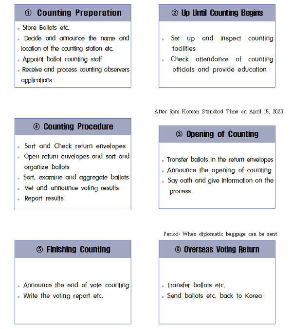 The NEC closely discussed the safe return of overseas voting with the Ministry of Foreign Affairs, overseas missions, and transportation companies as flights were suspended or reduced due to the spread of COVID-19, but it was decided that 18 overseas missions would unavoidably have to count their ballots on site.