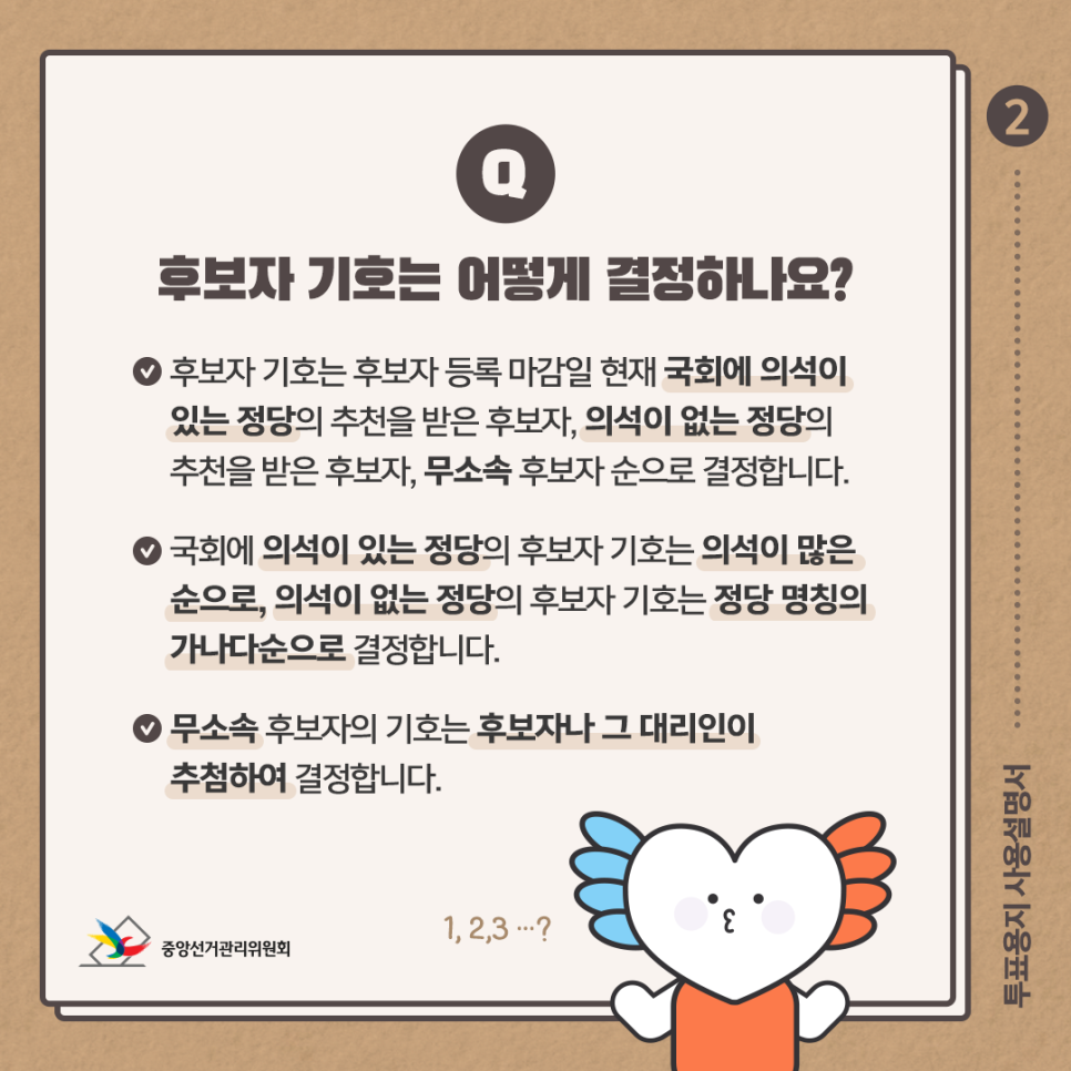 ✔ 후보자 기호는 후보자 등록 마감일 현재 국회에 의석이 있는 정당의 추천을 받은 후보자, 의석이 없는 정당의 추천을 받은 후보자, 무소속 후보자 순으로 결정합니다.