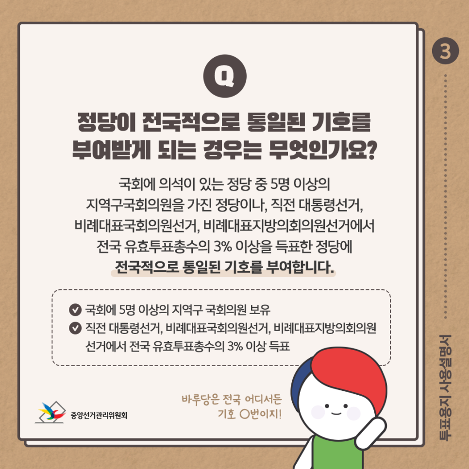 국회의 의석이 있는 정당 중 5명 이상의 지역구국회의원을 가진 정당이나 직전 대통령선거, 비례대표국회의원선거, 비례대표지방의회의원선거에서 전국 유효투표총수의 3% 이상을 득표한 정당에 전국적으로 통일된 기호를 부여합니다.