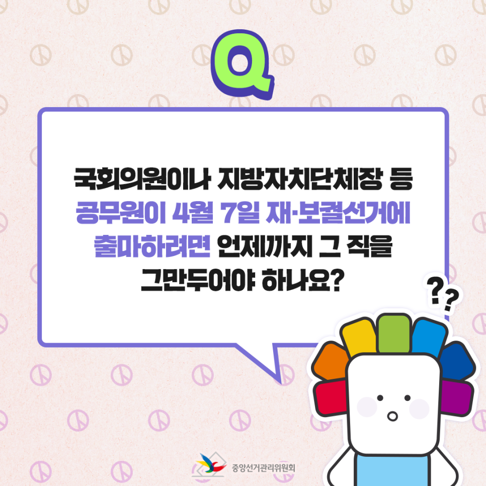 Q. 국회의원이나 지방자치단체장 등 공무원이 4월 7일 재·보궐선거에 출마하려면 언제까지 그 직을 그만두어야 하나요?