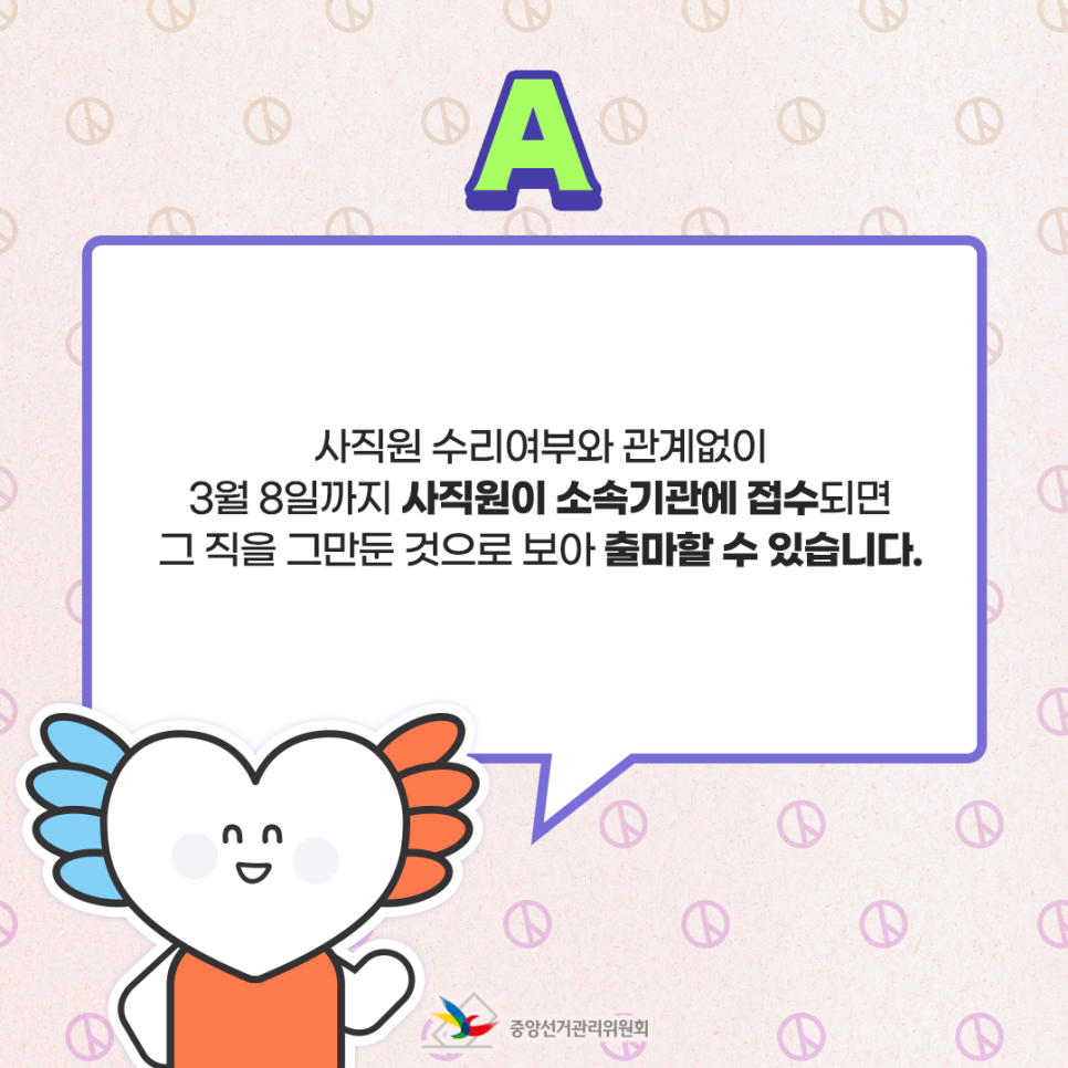 A. 사직원 수리 여부와 관계없이 3월 8일까지 사직원이 소속기관에 접수되면 그 직을 그만둔 것으로 보아 출마할 수 있습니다.