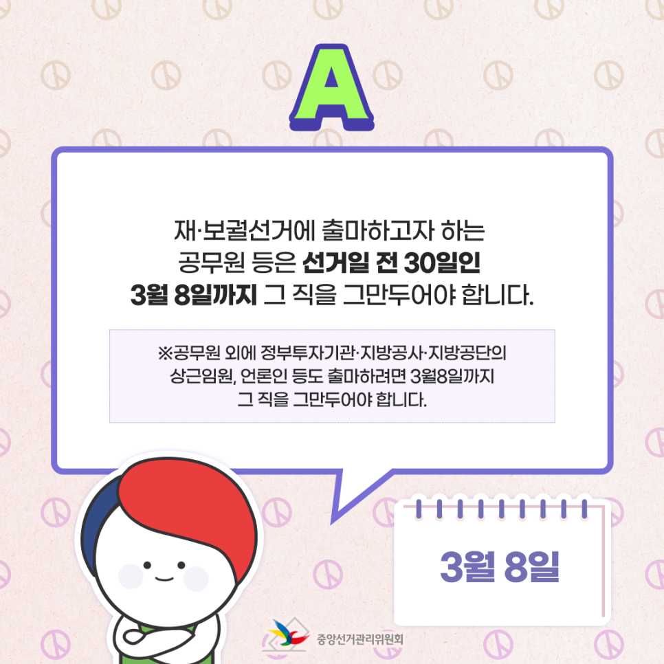 A. 재·보궐선거에 출마하고자 하는 공무원 등은 선거일 전 30일인 3월 8일까지 그 직을 그만두어야 합니다.