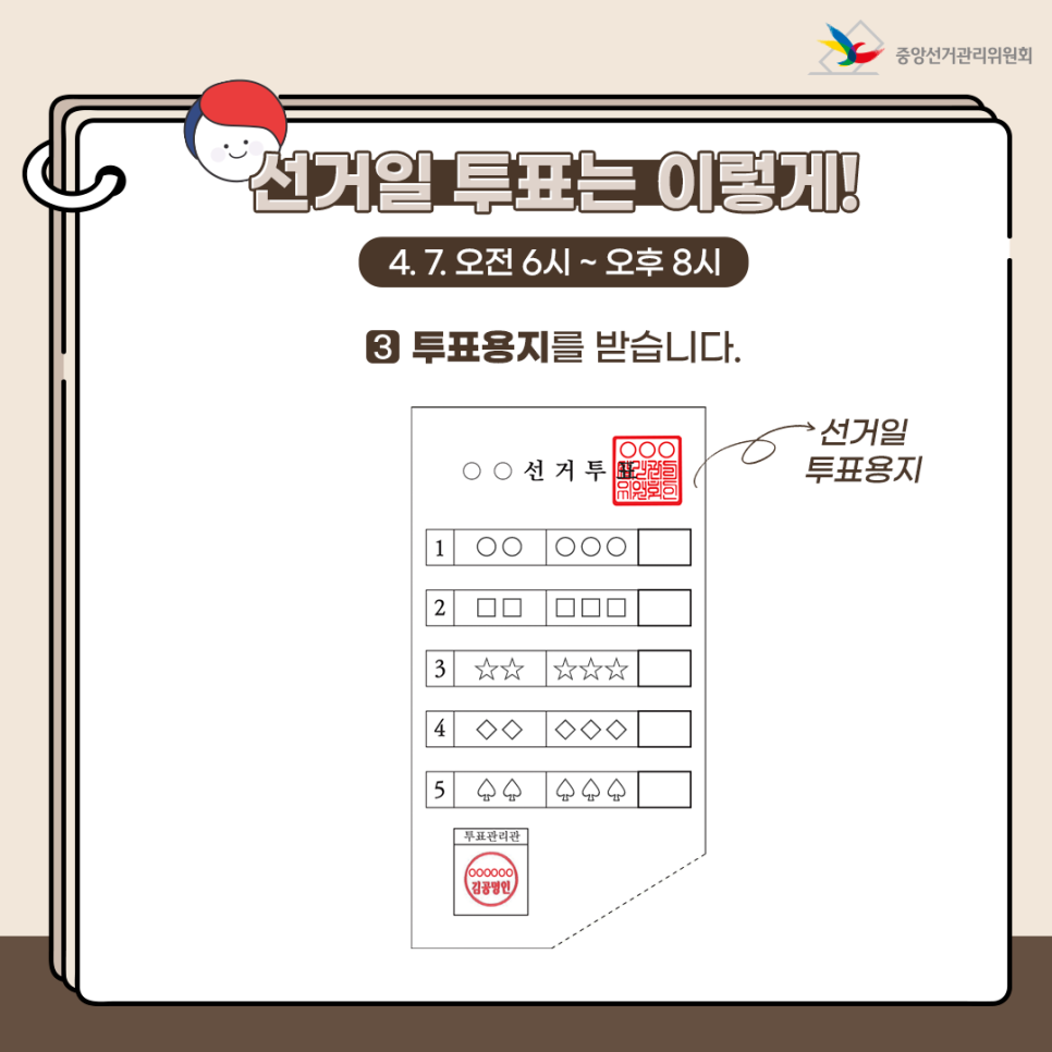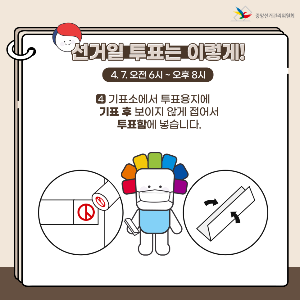④ 기표소에서 투표용지에 기표 후 보이지 않게 접어서 투표함에 넣습니다.