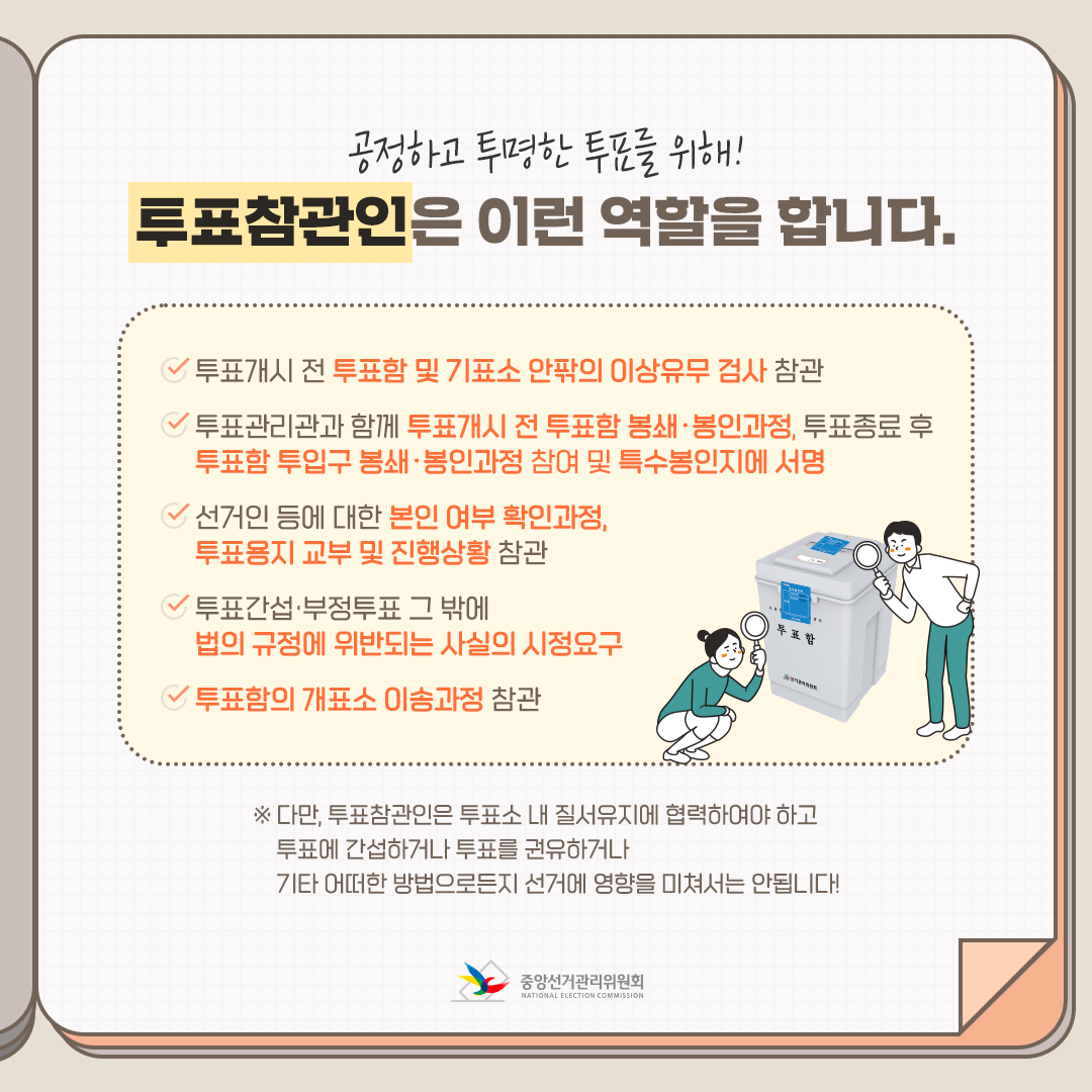 ※ 다만, 투표참관인은 투표소 내 질서유지에 협력하여야 하고 투표에 간섭하거나 투표를 권유하거나 기타 어떠한 방법으로든지 선거에 영향을 미쳐서는 안됩니다!