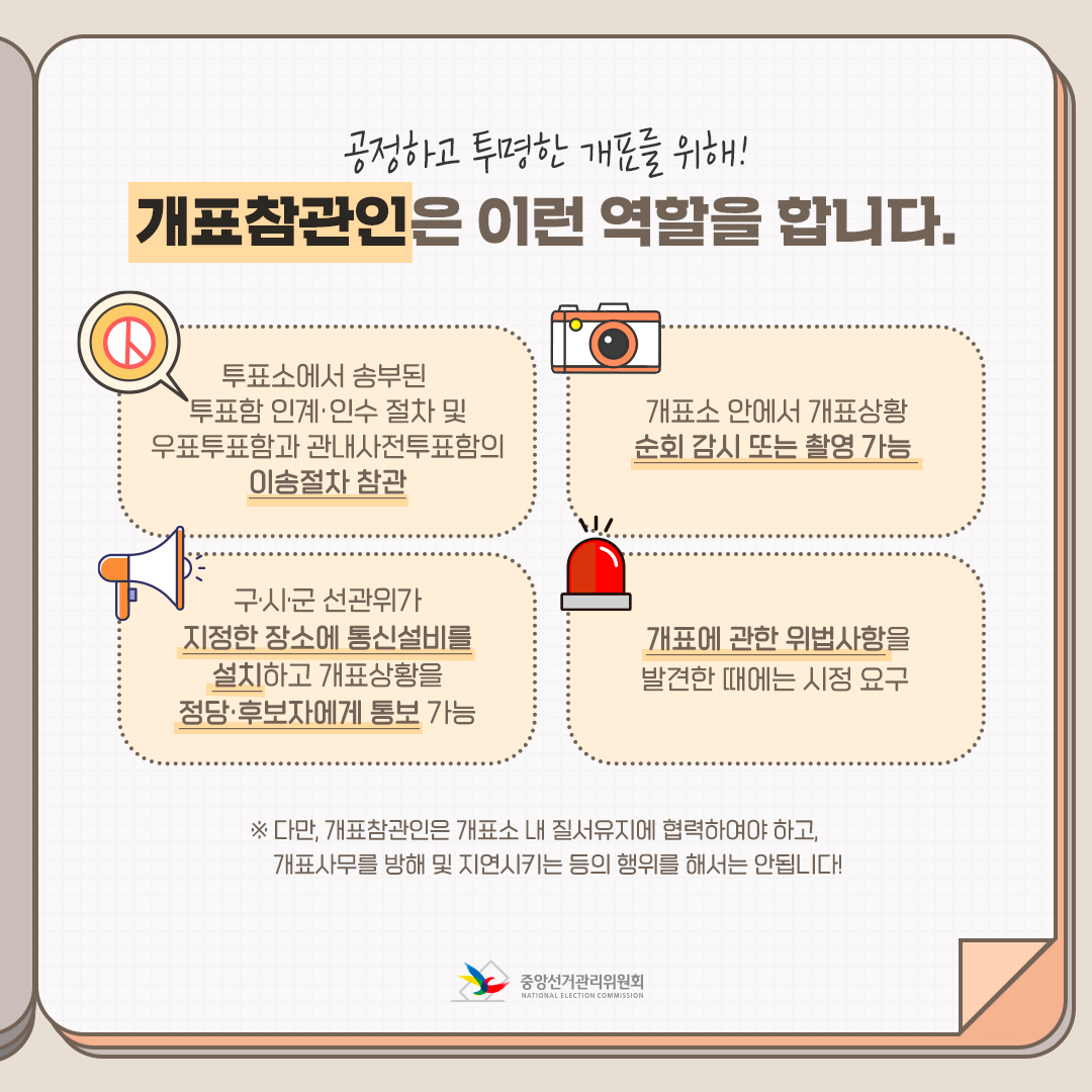 ※ 다만, 개표참관인은 개표소 내 질서유지에 협력하여야 하고, 개표사무를 방해 및 지연시키는 등의 행위를 해서는 안됩니다!