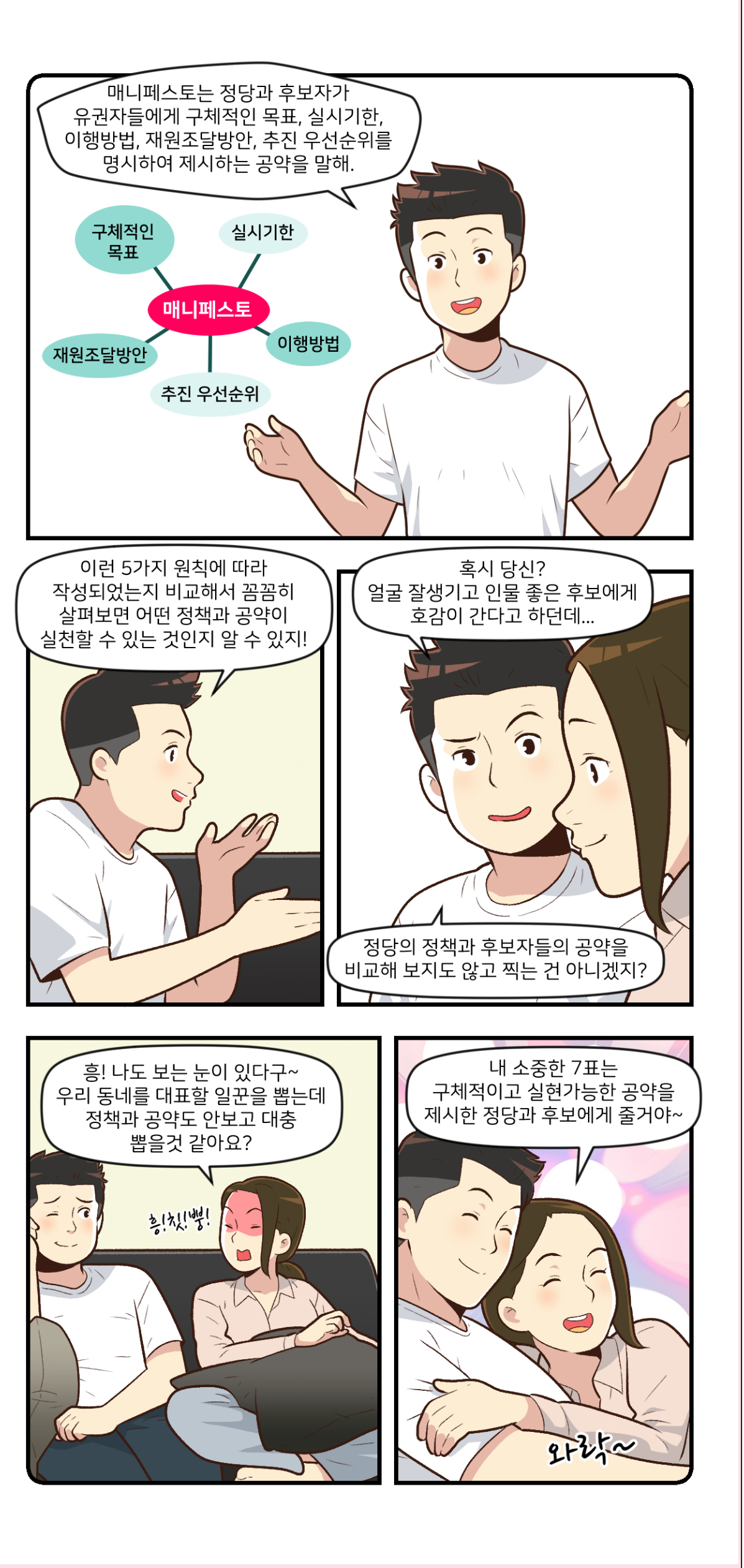공약을 볼 땐 매니페스토에 근거해서 작성되었는지 비교해서 살펴봐야 해~