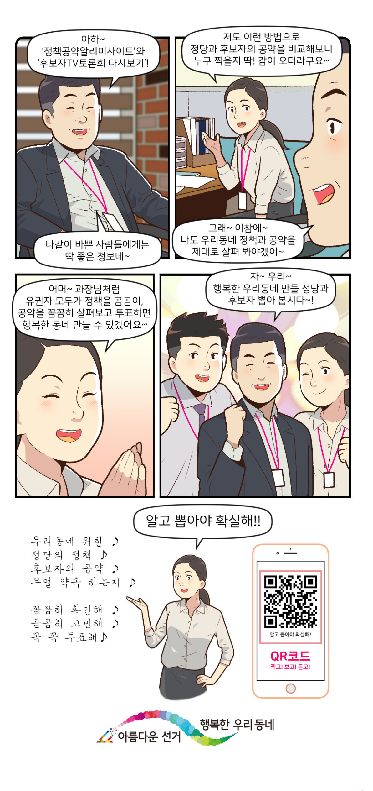 어머~ 과장님처럼 유권자가 모두 정책을 곰곰이, 공약일 꼼꼼히 살펴보고 투표하면 행복한 동네 만들 수 있겠어요~
