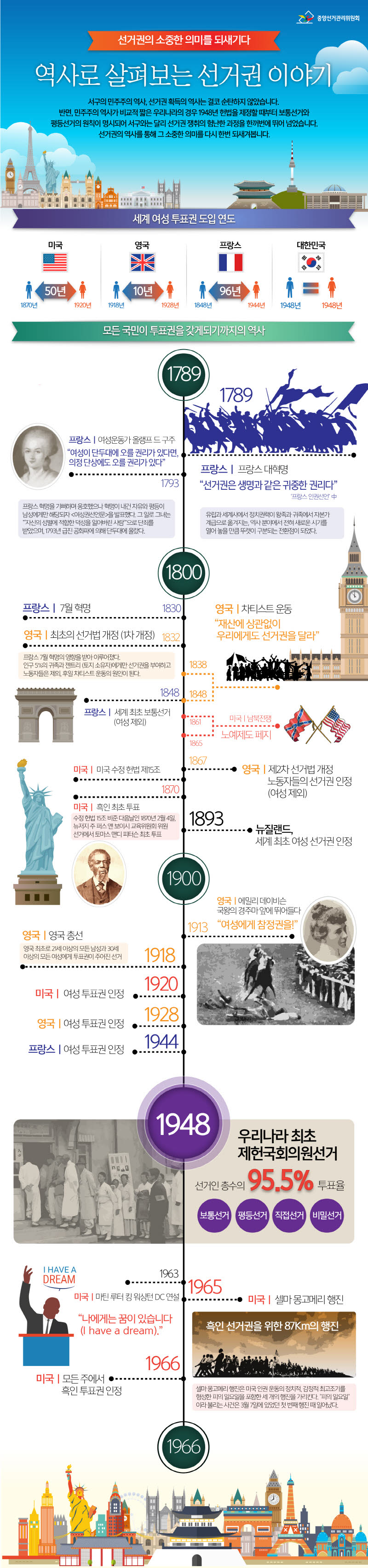 선거권의 역사를 통해 그 소중한 의미를 다시 한번 되새겨봅니다.세계 여성 투표권 도입 연도미국 : 1870년(남) <- 50년 -> 1920년(여)영국 : 1918년(남) <- 10년 -> 1928년(여)프랑스 : 1848년(남) <- 96년 -> 1944년(여)