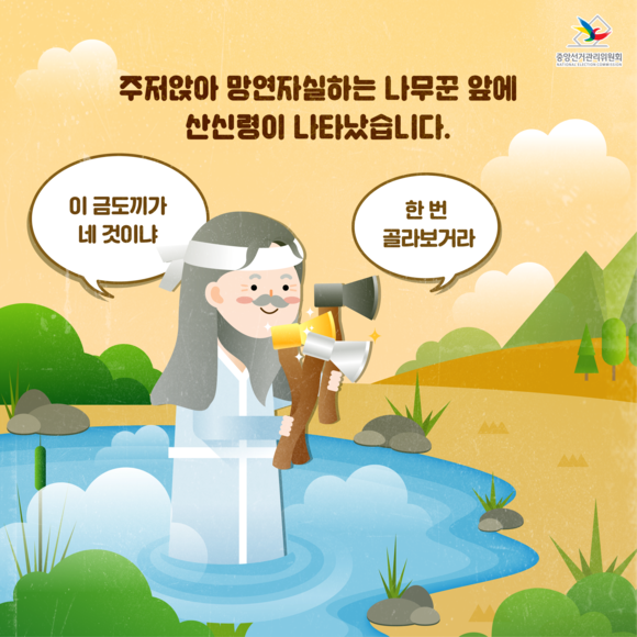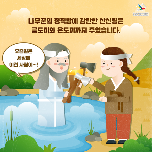 나무꾼의 정직함에 감탄한 산신령은