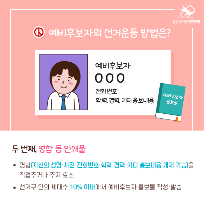 -명함(자신의 성명·사진·전화번호·학력·경력·기타 홍보내용 게재 가능)을 직접주거나 호소