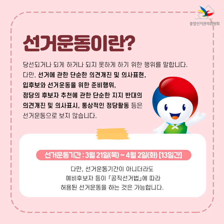 선거운동기간 : 3월 21일(목) ~ 4월 2일(화) [13일간] 다만, 선거운동기간이 아니더라도 예비후보자 등이 [공직선거법]에 따라 허용된 선거운동을 하는 것은 가능합니다.