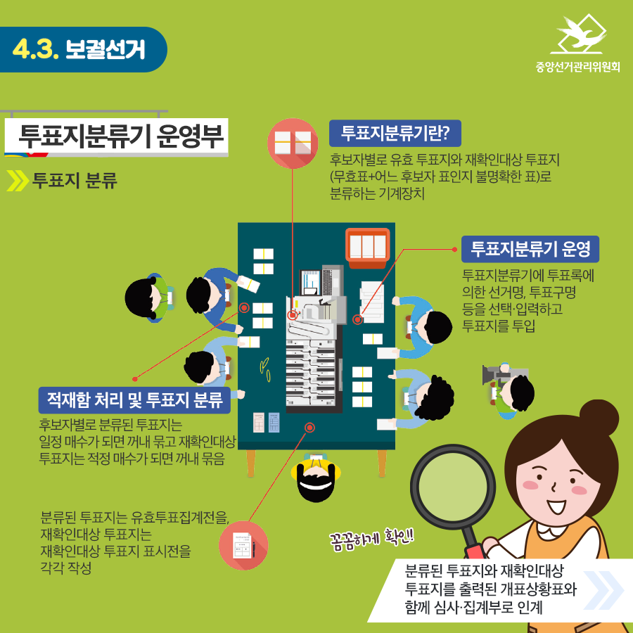 심사ㆍ집계부 : 투표지 심사ㆍ집계 분리된 투표지의 심사ㆍ확인 - 후보자별로 1차 분류된 투표지는 묶음별로 투표지심사계수기를 이용하여 타 후보자 또는 무효투표지 혼입 여부 및 득표수 이상여부 전량 육안 확인