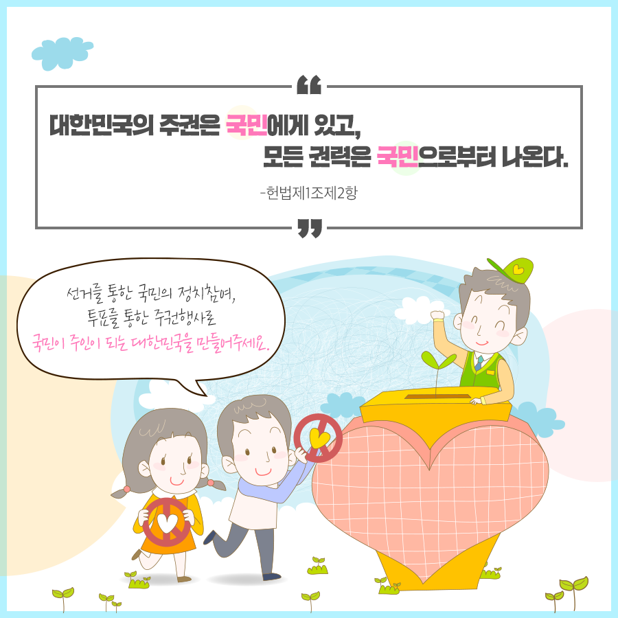 선거를 통한 국민의 정치참여, 투표를 통한 주권행사로 국민이 주인이 되는 대한민국을 만들어주세요.