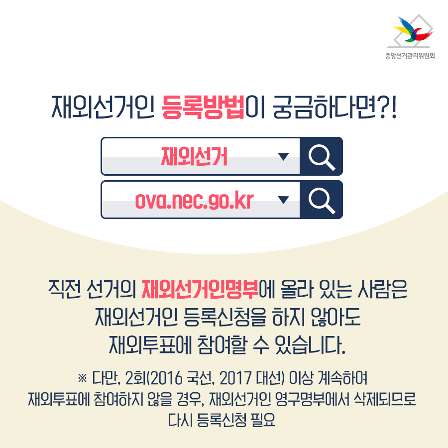 ※ 다만, 2회(2016 국선, 2017 대선) 이상 계속하여 재외투표에 참여하지 않을 경우, 재외선거인 영구명부에서 삭제되므로 다시 등록신청 필요 인터넷으로 등록하니까 편하고 쉽네요!