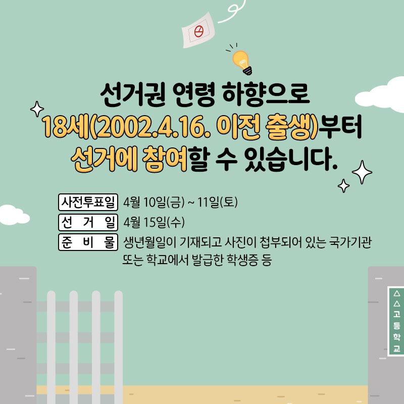 선거권 연령 하향으로 18세(2002.4.16. 이전 출생)부터 선거에 참여할 수 있습니다.