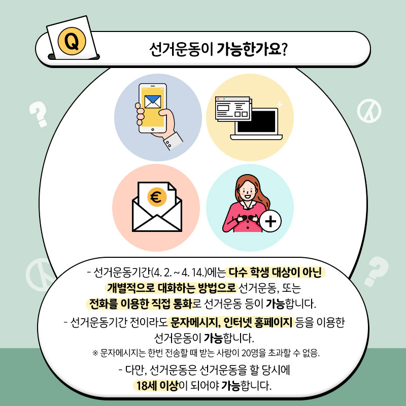 - 선거운동기간(4. 2. ~ 4. 14.)에는 다수 학생 대상이 아닌 개별적으로 대화하는 방법으로 선거운동, 또는 전화를 이용한 직접 통화로 선거운동 등이 가능합니다.