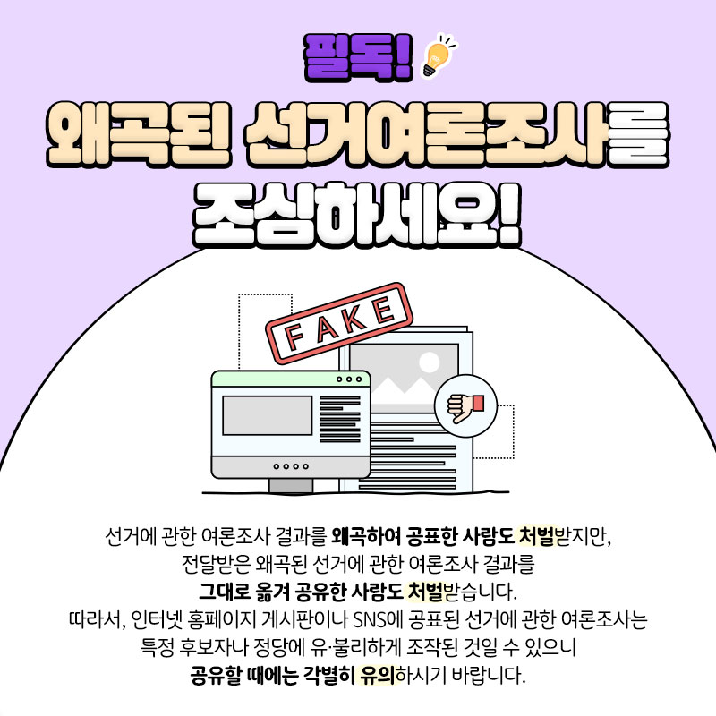 따라서, 인터넷 홈페이지 게시판이나 SNS에 공표된 선거에 관한 여론조사는 특정 후보자나 정당에 유·불리하게 조작된 것일 수 있으니 공유할 때에는 각별히 유의하시기 바랍니다