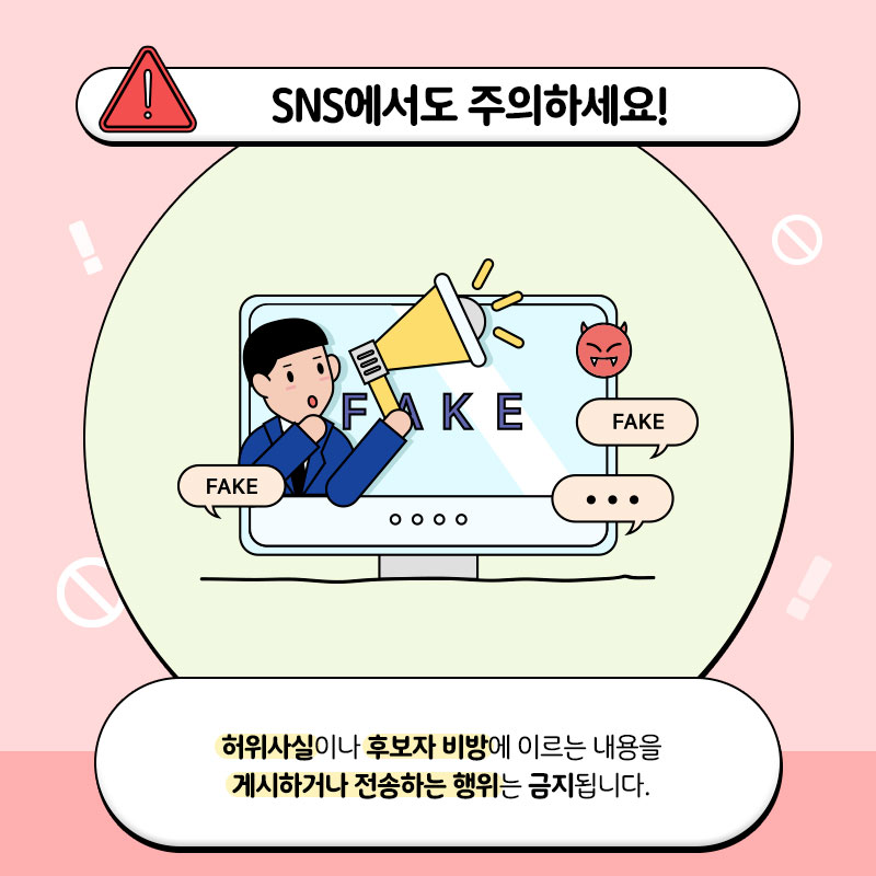 허위사실이나 후보자 비방에 이르는 내용을 게시하거나 전송하는 행위는 금지됩니다.