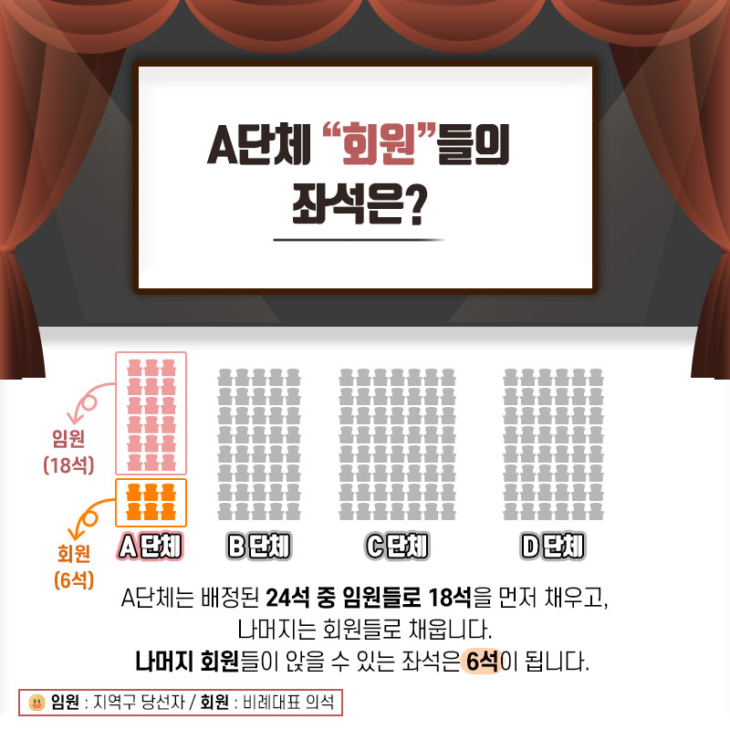 A단체는 배정된 24석 중 임원들로 18석을 먼저 채우고, 나머지는 회원들로 채웁니다.