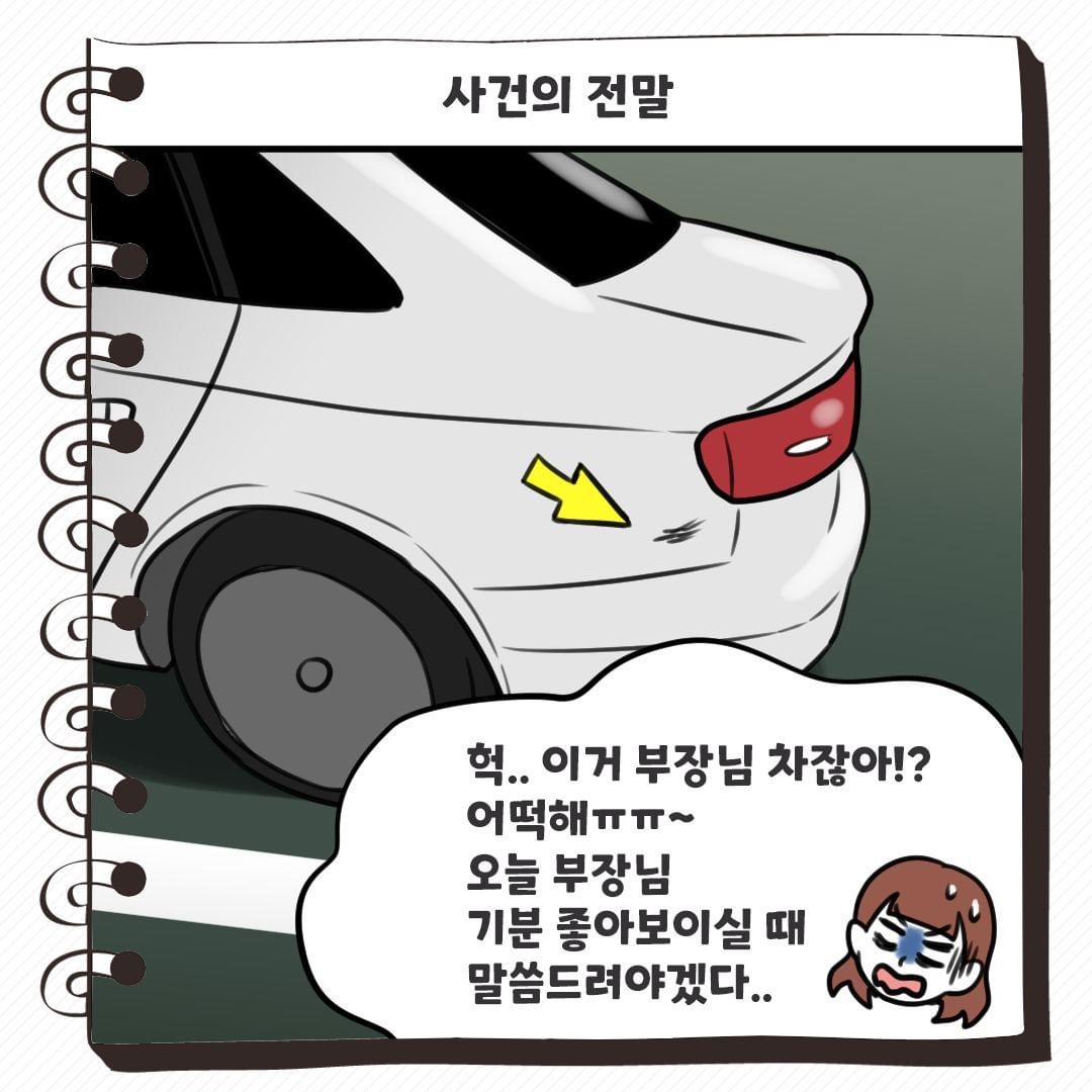 헉.. 이거 부장님 차잖아!? 어떡해ㅠㅠ~ 오늘 부장님 기분 좋아보이실 때 말씀드려야겠다..