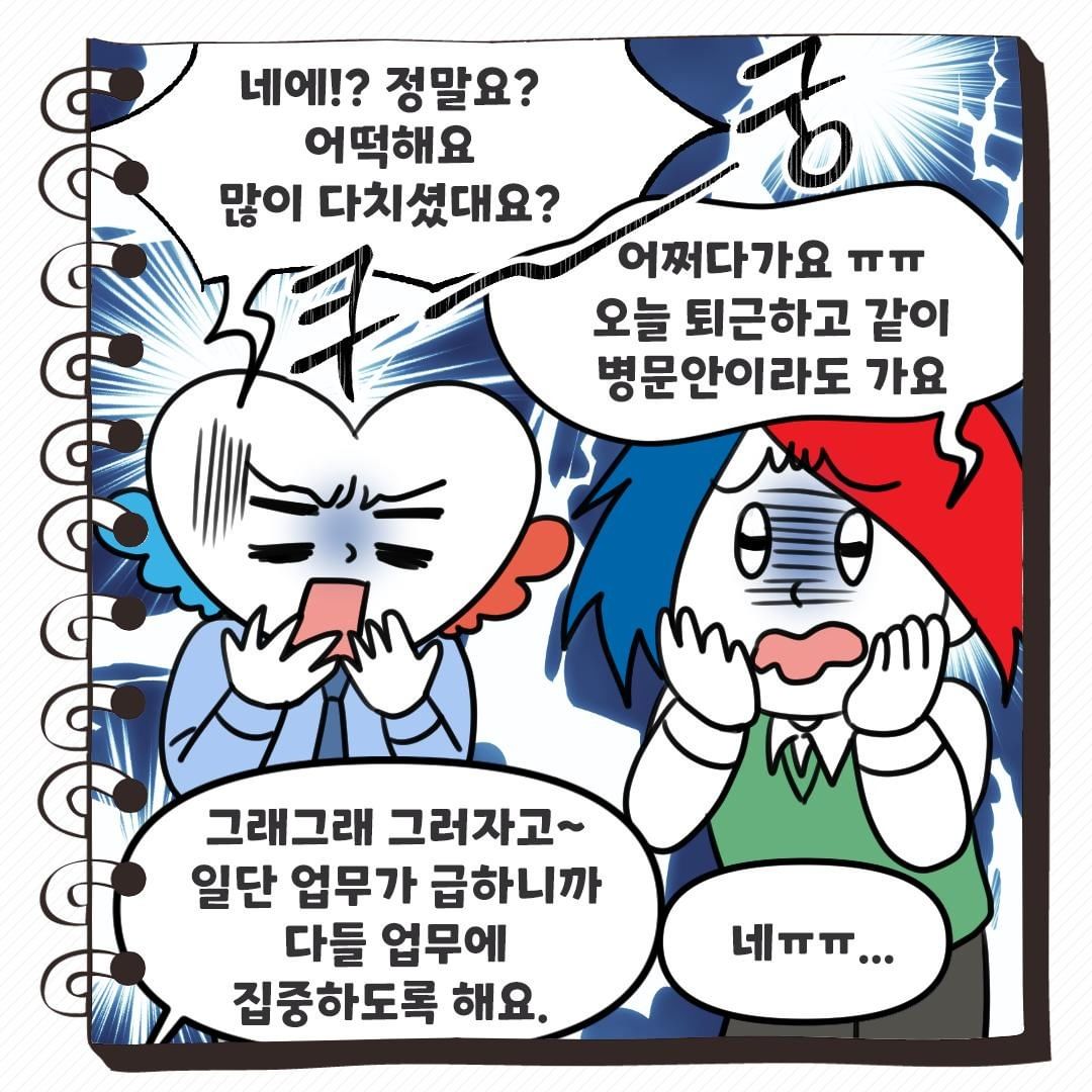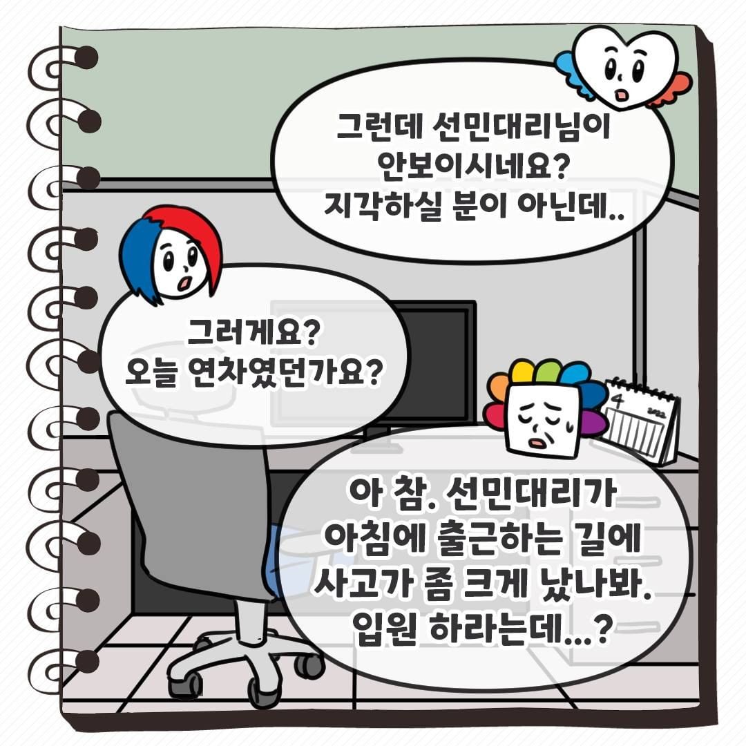 아 참. 선민대리가 아침에 출근하는 길에 사고가 좀 크게 났나봐. 입원 하라는데...?