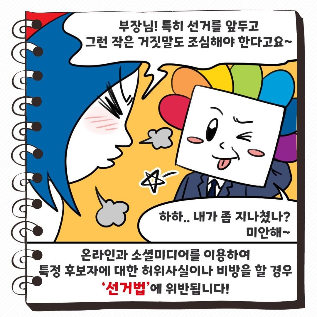 온라인과 소셜미디어를 이용하여 특정 후보자에 대한 허위사실이나 비방을 할 경우 '선거법' 에 위반됩니다!