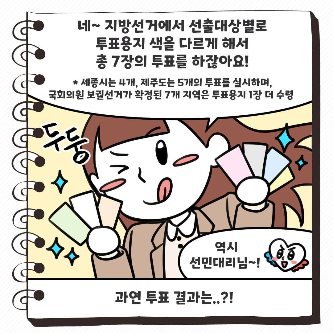 네~ 지방선거에서 선출대상별로 투표용지 색을 다르게 해서 총 7장의 투표를 하잖아요!